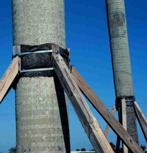 Las palmeras altas deben estar provistas de soportes para evitar que se caigan con vientos fuertes y para proporcionar una interfaz estable entre la raíz y el suelo (Broschat y Donselman 1987). La plantación profunda no es una alternativa aceptable al soporte mecánico. Las vigas de soporte no deben clavarse directamente en el tronco, ya que cualquier herida en el tronco de la palmera es permanente y puede permitir la entrada de patógenos, como Thielaviopsis .