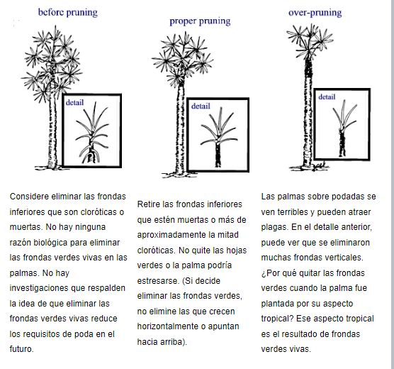 Hay varias razones para podar las palmas 1) La eliminación de las frondas muertas y moribundas mejora la apariencia de una palma. 2) Las frondas muertas y moribundas y los pecíolos sueltos se adhieren débilmente a algunas palmeras y pueden poner en riesgo a personas y propiedades en caso de que caigan de las palmas altas. Las personas han resultado gravemente heridas por la caída de frondas. Las hojas de palma muertas y moribundas deben eliminarse regularmente para reducir este riesgo. 3)La poda puede eliminar los racimos de frutas, especialmente en paisajes públicos donde la caída de frutas y restos de flores puede ser desordenada y peligrosa. Algunas palmeras generan grandes cantidades de plántulas cerca de la planta. Eliminar flores o frutos reduce la cantidad de plántulas potenciales. 4) Retire los brotes de la base del tronco.