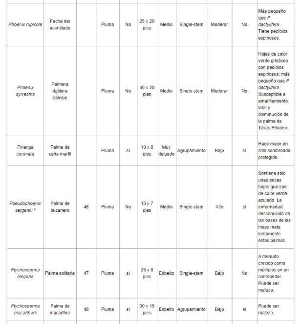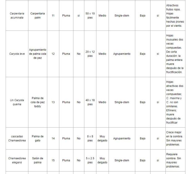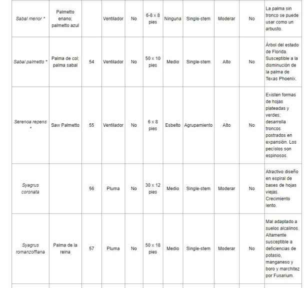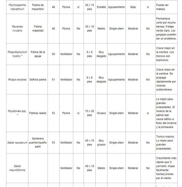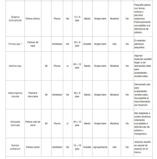 Por lo general, a las palmeras les irá mejor en tormentas de viento que a los árboles de hoja ancha, pero algunas están mejor adaptadas que otras. La selección adecuada de la palmera mejorará las posibilidades de que una palmera prospere en un lugar en particular. La Tabla 1 enumera una serie de especies que se pueden cultivar en los paisajes del sur de Florida. Aunque muchas otras especies se han cultivado con éxito en el sur de Florida, son relativamente raras en la industria de viveros y, por lo tanto, no están fácilmente disponibles.