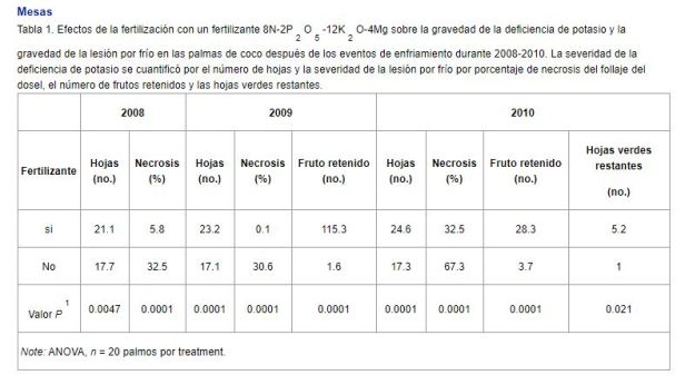 Es bien sabido que las especies de palmeras difieren mucho en su resistencia al frío. Meerow (2005) proporciona información hortícola sobre aquellas especies de palmeras que se sabe que son relativamente resistentes al frío. Para cualquier palmera, plantarlas en áreas protegidas por edificios o copas de los árboles puede aumentar sus posibilidades de supervivencia durante el clima frío. Estudios recientes también han demostrado que la fertilización adecuada puede mejorar la resistencia al frío de las palmeras. Broschat (2010) encontró que la necrosis causada por las temperaturas de enfriamiento en las palmeras de coco fue significativamente menor en las palmeras fertilizadas rutinariamente con un fertilizante de palma 8N-2P 2 O 5 -12K 2 O-4Mg más micronutrientes que en las palmas no fertilizadas (Tabla 1). Ver Fertilización de palmeras cultivadas en campo y paisajísticas en Florida.. Aunque no está documentado experimentalmente, existe evidencia anecdótica de que el exceso de adelgazamiento también puede reducir las tasas de supervivencia de la palma después de los eventos de clima frío.