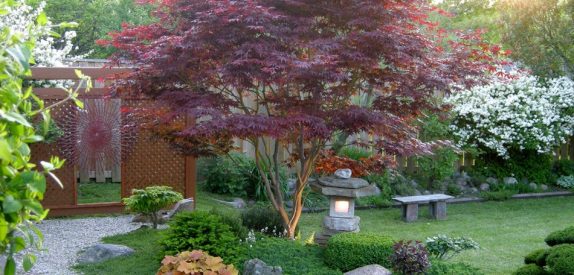 Jardines orientales: Afortunadamente, esta no es solo una colección de bonsai, ya que muchos árboles frutales son adecuados para su uso en esta forma de jardín. Las especies de coníferas de hoja perenne generalmente forman el fondo y los árboles frutales crean puntos focales en primer plano. Melocotón, ciruela, cereza, arce japonés, acebo del cabo, coníferas.