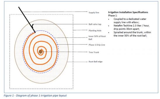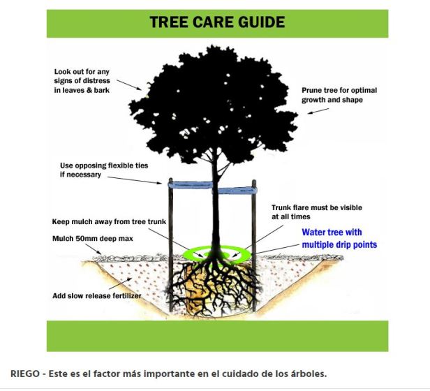 - Riegue el árbol apropiadamente resultando en la humectación del 100% del cepellón sin ahogar el árbol. Para árboles grandes es de vital importancia instalar un sistema de riego de punto de goteo múltiple controlado por computadora