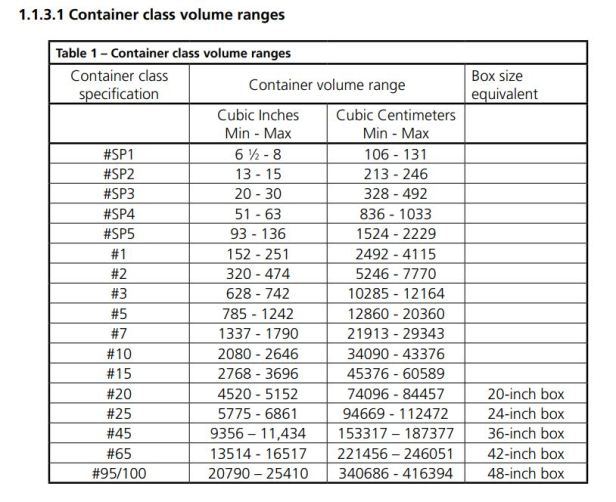 Las especificaciones para el vivero cultivado en contenedor deben incluir una especificación de clase de contenedor, de acuerdo con la Tabla 1, a continuación, además de la especificación del tamaño de la planta. Los envases comercializados y vendidos que indican una designación de «intercambio» o «#» deben tener volúmenes dentro de los rangos que se muestran en la Tabla 1 para cumplir con esta norma.