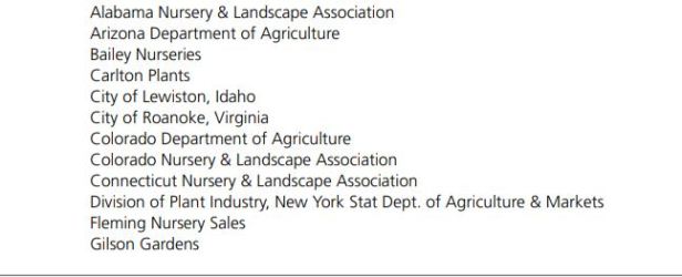 La American Standard for Nursery Stock (ANSI Z60.1) es publicada por: American Horticulture Industry Association d / b / a American Hort, una organización de desarrollo de normas acreditada por ANSI 2130 Stella Court, Columbus, OH 43215 614 487 1117 www.AmericanHort.org