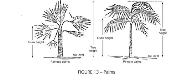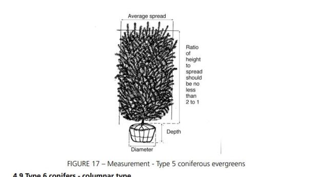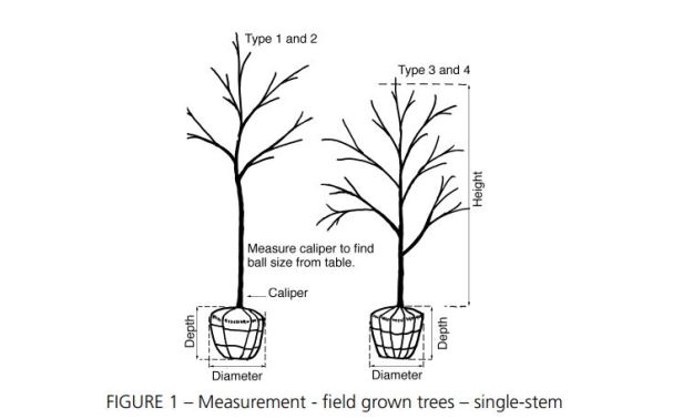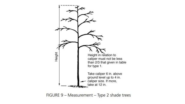Las especificaciones para árboles en forma de arbusto y árboles de tallo múltiple deben incluir la altura. Las especificaciones para los árboles en forma de grupo deben incluir el número mínimo requerido de tallos (troncos), altura o calibrador, según sea apropiado para el tipo de planta, y el método utilizado para determinar la medición del calibrador, si se especifica calibrador (ver Sección
