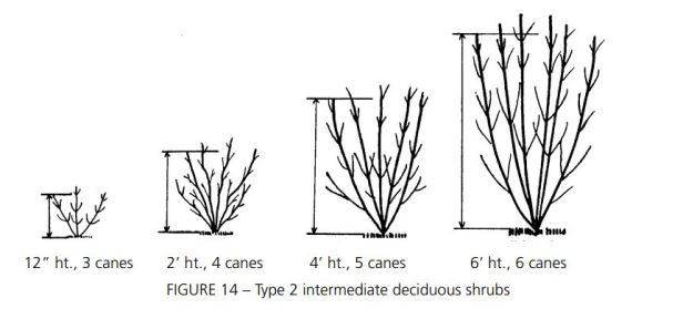 Para los arbustos caducifolios, la medición de la altura se extenderá hasta la parte superior de todos los bastones que cumplan con la especificación de altura, según corresponda al tipo de planta. Esto generalmente está en un punto debajo del punto más alto de la planta. Por ejemplo, un arbusto caducifolio de 2 ‘Tipo 2 debe tener cuatro bastones que alcancen al menos 2’, incluso si dos o tres bastones son más altos que 2 ‘(ver Figura 3).