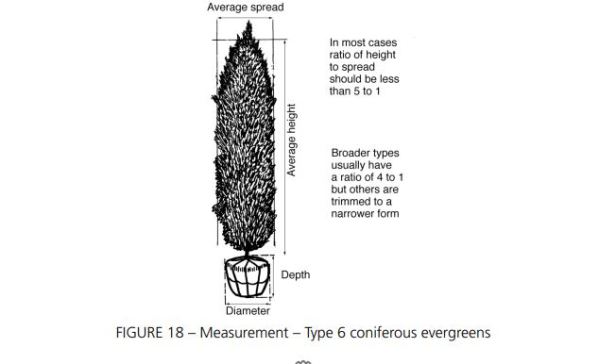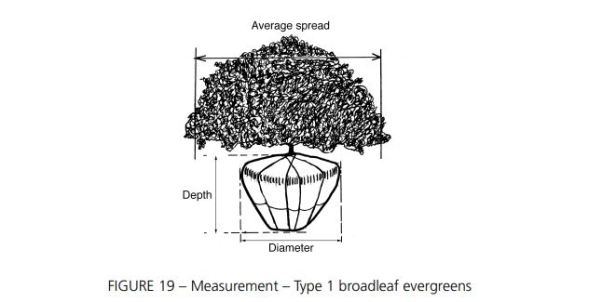 La medición de la altura se tomará desde el nivel del suelo para el material cultivado en el campo y desde la línea del suelo para el material cultivado en contenedores, que debe estar en o cerca de la parte superior de la antorcha radicular, y desde el Destello de raíz para plantas de raíz desnuda. La medida de la extensión debe ser la extensión promedio de las ramas de la planta, sin hojas para arbustos caducifolios, incluidas las hojas para árboles de hoja perenne (ver Figura 2)