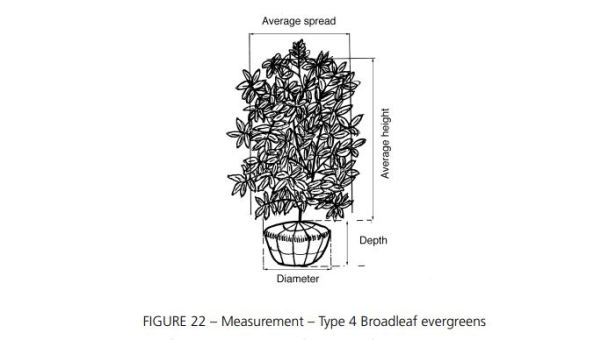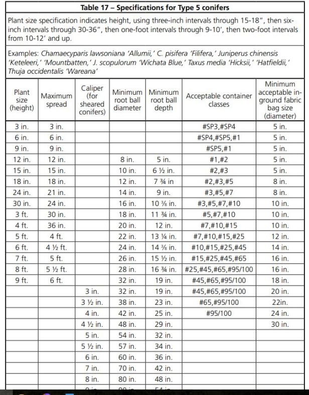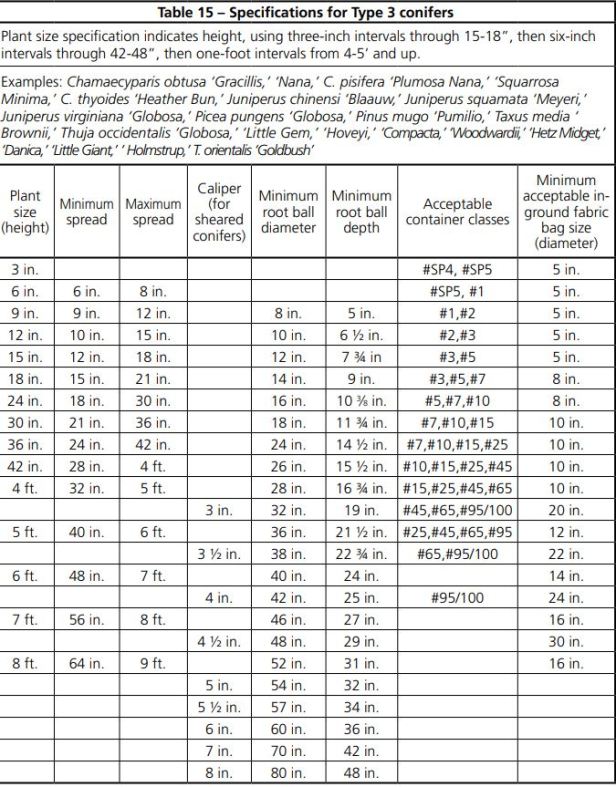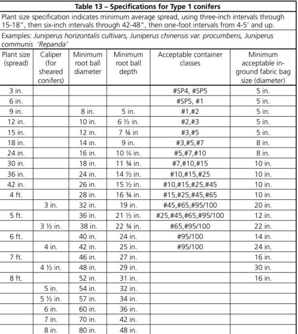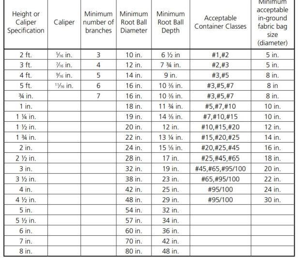 Las especificaciones deben incluir el tamaño de la planta, por calibre, altura o ancho, según sea apropiado para el tipo de planta como se establece en la sección de tipo de planta apropiada, excepto para ciertas plantas perennes y no resistentes al invierno arbustos, que pueden especificarse solo por clase de contenedor (Ver Sección 13 – plantas perennes herbáceas, hierbas ornamentales, cubiertas de tierra y vides, y Sección 3.1.0 – Arbustos caducifolios tiernos tipo 0).