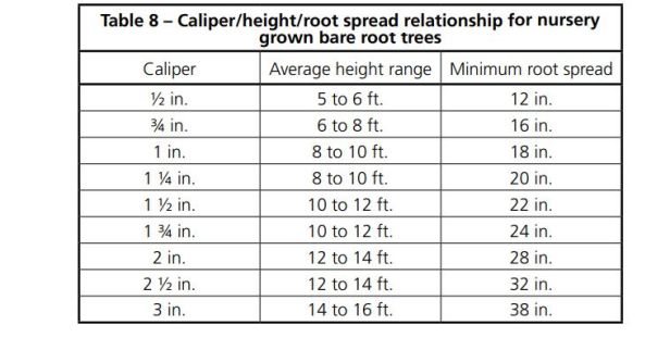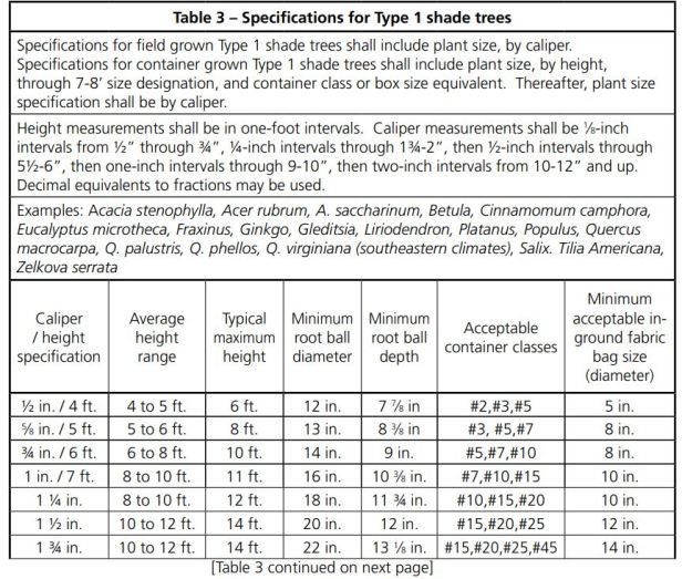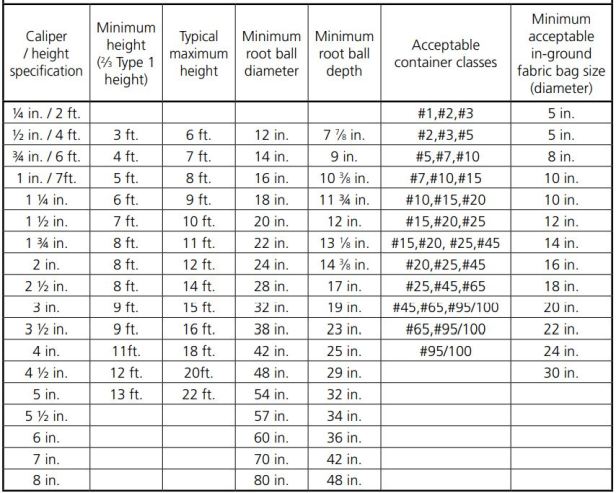 Las especificaciones de tamaño de planta deben incluir solo la medición mínima del intervalo de tamaño de planta deseado. La medida así especificada es el tamaño mínimo permitido e incluirá plantas desde ese tamaño mínimo hasta, pero sin incluir el tamaño mínimo en el próximo intervalo de tamaño más grande. Los intervalos de tamaño aceptables para cada tipo de planta se muestran en la sección correspondiente del tipo de planta. Por ejemplo, una especificación para un «2.5 in. Cal». El árbol de sombra Tipo 1 hace referencia al intervalo de tamaño de la pinza de «2.5 a 3 pulgadas», mientras que una especificación para un «5 pies». El árbol de expansión tipo 4 hace referencia a los «5-6 pies». intervalo de tamaño de altura.