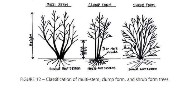 Las especificaciones para árboles con tallos múltiples (troncos) deben incluir si la forma deseada es forma de arbusto, forma de racimo o tallo múltiple, como se establece en la Sección 2.5.
