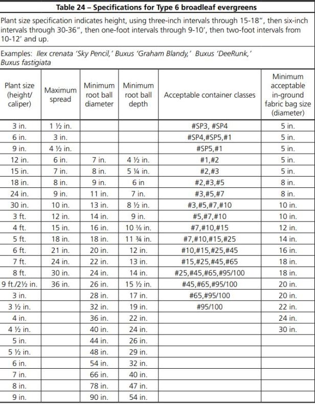 Si se requiere una especificación del tamaño de la planta y solo se especifica la clase de contenedor, la especificación está incompleta y la Norma no proporciona un tamaño mínimo de planta correspondiente (para excepciones, consulte la Sección 13 – plantas perennes herbáceas, hierbas ornamentales, cubiertas de tierra y vides, y Sección 3.1.0 – Arbustos caducifolios tiernos tipo 0). Las tablas que muestran las especificaciones de clase de contenedor recomendadas deben usarse como una guía para determinar qué especificación de clase de contenedor debe acompañar a la especificación del tamaño de la planta, y no pueden usarse como base para rechazar el stock de vivero en función del tamaño de planta mínimo o máximo que se muestra en las tablas en casos donde una especificación no incluye una especificación de tamaño de planta. En tales casos, las partes deben consultar el «requisito general del sistema de raíces» para todas las existencias de vivero cultivadas en contenedores (ver la Sección 1.6, a continuación) para determinar si el sistema de raíces cumple con el Estándar.