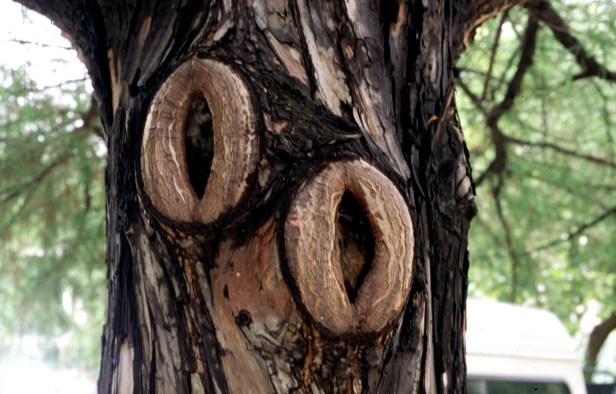 • Heridas, de gran superficie, que nunca sanan por completo. Los patógenos (bacterias, hongos, insectos) penetran la madera expuesta, causando podredumbre interna. Terminan cavando cavidades que progresan en la madera, debilitando la solidez del árbol.