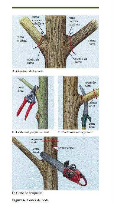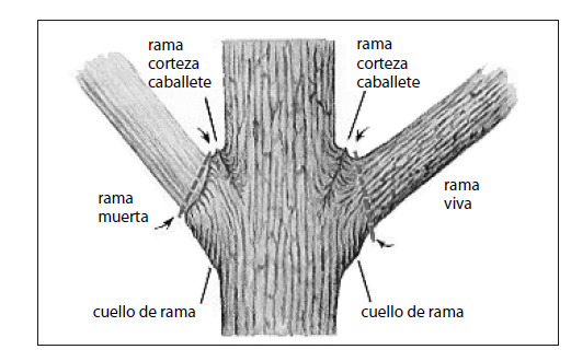 respete la ubicación y el ángulo del corte para no alterar el cordón cicatricial Realice el corte en el plano que une la arruga exterior de la corteza y el extremo del cuello de la rama (no siempre muy visible) sin alterar los tejidos del tronco para facilitar la curación. El corte generalmente debe ser perpendicular al eje de la rama a eliminar.
