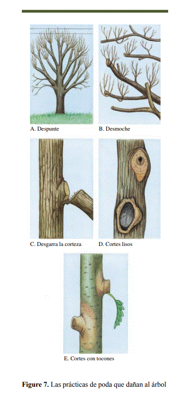 • Las reservas del árbol (azúcar, almidón) ubicadas en la madera desaparecen al cortar ramas grandes. El árbol debilitado carece de los recursos para curar sus heridas y luchar contra los patógenos, por lo que se vuelve más vulnerable a los ataques externos.