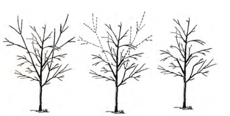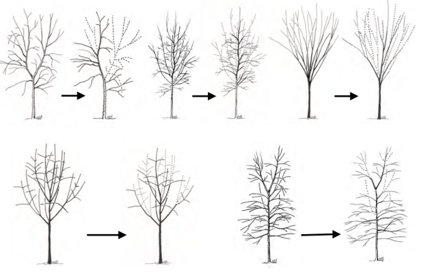 Pode los árboles en la plantación a un líder central quitando o acortando los tallos competitivos (se muestran) (Figura 16).