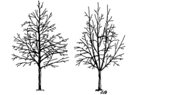 . Buena estructura de árbol (izquierda); estructura deficiente (derecha). Los árboles con ramas espaciadas a lo largo del líder central o tronco (Figura 15, izquierda) son más fuertes que los árboles con ramas agrupadas (Figura 15, derecha).