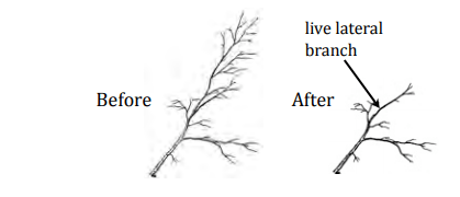 Las ramas de diámetro pequeño (Figura 5, izquierda), particularmente en árboles de menos de 1 pulgada de calibre, deben estar presentes a lo largo del tronco inferior debajo de la rama principal más baja. Estas ramas no deben tener más de 3/8 de pulgada de diámetro.