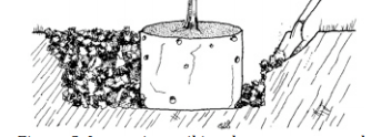 Entutorado: El método de entutorado depende de la capacidad de un árbol para sostenerse por sí mismo y de la ubicación del sitio de plantación. El entutorado se usa para mantener los árboles erguidos, permitir que el cepellón se ancle y proteger el tronco del daño causado por el equipo. Las estacas deben eliminarse cuando el árbol puede sostenerse por sí solo y el cepellón está anclado. Las estacas se deben colocar alejadas del árbol y aseguradas al tronco en el punto donde el árbol está derecho. No use alambre ni ninguna correa que pueda ceñir el árbol o dañar la corteza. Si un árbol no puede sostenerse por sí solo después del replanteo, se puede usar una estaca con tablillas atada directamente al tronco hecha de bambú, acero de resorte o una varilla de Viberglass para enderezar el tronco superior y / o la guía. Evite usar estacas secundarias de madera cuadrada. Instalación del árbol: quite la tierra y las raíces de la parte superior del cepellón para exponer el collar de la raíz; corte cualquier raíz que crezca sobre el collar (Figura 9).