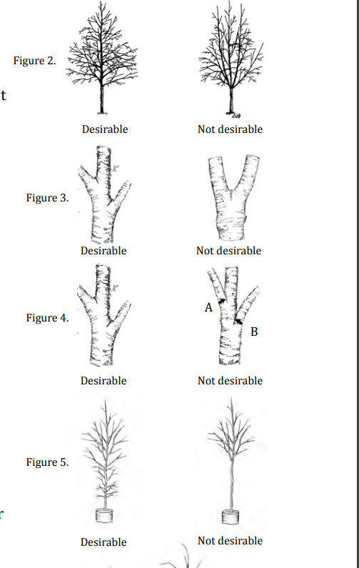 . Encabezar el árbol es aceptable siempre que el líder central se restablezca en el vivero. Las ramas principales (Figura 2) deben estar bien distribuidas a lo largo del líder central, no agrupadas. Deberán formar una corona equilibrada apropiada para el cultivar o la especie. Las ramas más grandes deben estar libres de inclusiones de corteza que se extiendan dentro de la unión de la rama (Figura 4 A y B).