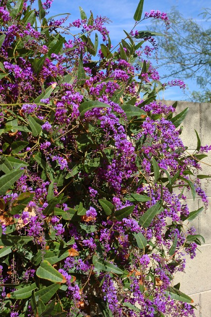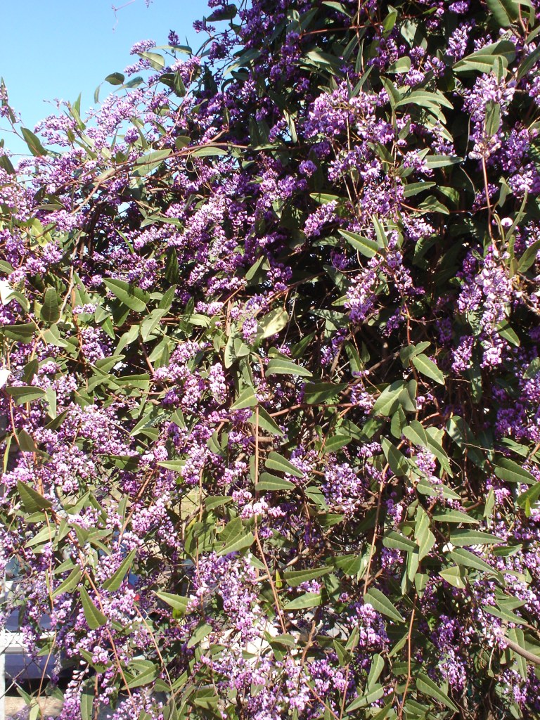Hace unos años la conocí envolviendo un poste de teléfonos en una carretera que conducía a una urbanización en Guillena, Sevilla, no la conocía, no la había visto nunca, me sorprendió ver el poste cubierto de flores azules en el margen de una carretera que nadie cuidaba. ¿ Como había llegado allí ¿ No era autóctona, ni la conocía como naturalizada, el viento, un pájaro, no creo que fuera plantada por nadie, Pero allí estaba acompaño las primeras fotos de mi encuentro con la Hardenbergia violácea. El segundo encuentro fue en un reparto de plantas a un cliente procedentes de un vivero.