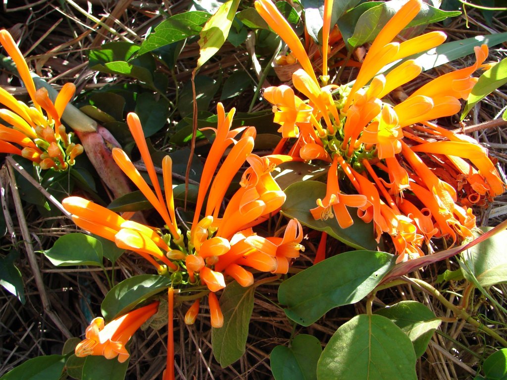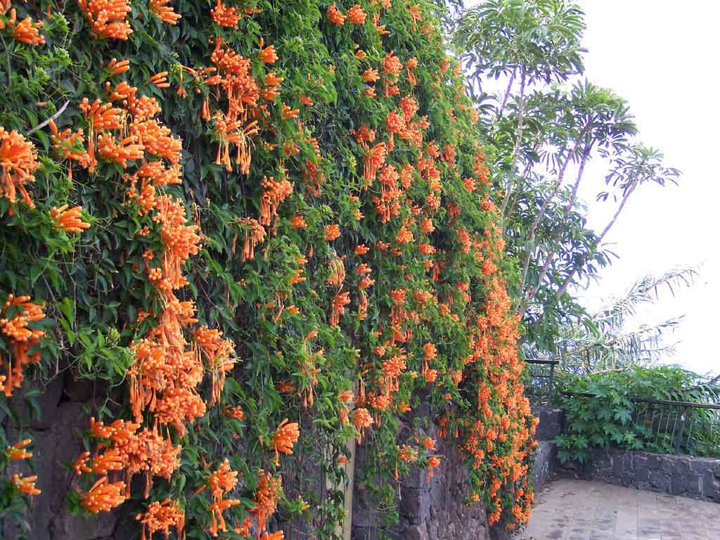 También conocida como Pyrostegia ignea, crece rápidamente trepando por zarcillos, esta vigorosa vid enredadera de hoja perenne hace una brillante exhibición en otoño e invierno de flores tubulares de 3 pulgadas de largo de color naranja rojizo que nacen en racimos de 15 a 20  Cubriendo todo lo que pueda ofrecer un buen soporte, la Pyrostegia debe plantarse con precaución, como se sabe  cubre, y luego estrangula a los árboles con su crecimiento desenfrenado.. Se necesita una poda fuerte o frecuente para contenerlo en espalderas o cenadores, pero la brillante exhibición de flores hace que este trabajo adicional valga la pena. Es ideal para cubrir vallas, pero a menudo produce la mayoría de las flores y el follaje en la parte superior de la valla. Regresar regularmente a varios de los tallos puede ayudar a desarrollar algunas de las flores y el follaje en las partes inferior y media de la valla.