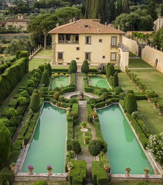Ahí va una historia de los jardines y ,lo que Monty Don no nos enseñó en su filmación y es que aparte del bellísimo jardín histórico renacentista los actuales propietarios disfrutan de una magnifica piscina siglo XX construida al fondo del jardín con vistas a la campiña y a la ciudad de Florencia.