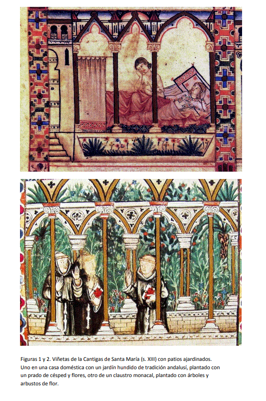 En los patios tenemos más suerte que en los jardines exteriores. Conocemos la arquitectura que rodea el jardín, los caminos que lo atraviesan. Pero poco más. Les invito a reflexionar sobre dos patios del siglo XIII dibujados en las Cantigas de Santa María. Uno es de tradición andalusí, con el terreno de cultivo bajado un poco y con un
