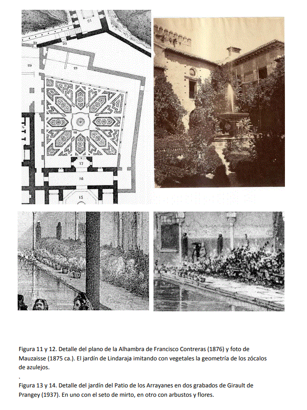 Ya hemos señalado como a veces los artistas románticos dibujaban la realidad de los jardines tal y como la conocían y a veces la dibujaban tal y como imaginaban que había sido en el pasado islámico. Con curiosas paradojas como los grabados del Patio de los Arrayanes que estampa Girault de Prangey que en 1837 publica en un mismo libro un grabado con los setos tal y como estaban y otro con macizos de flores tan y cómo imaginaba que podían estar.