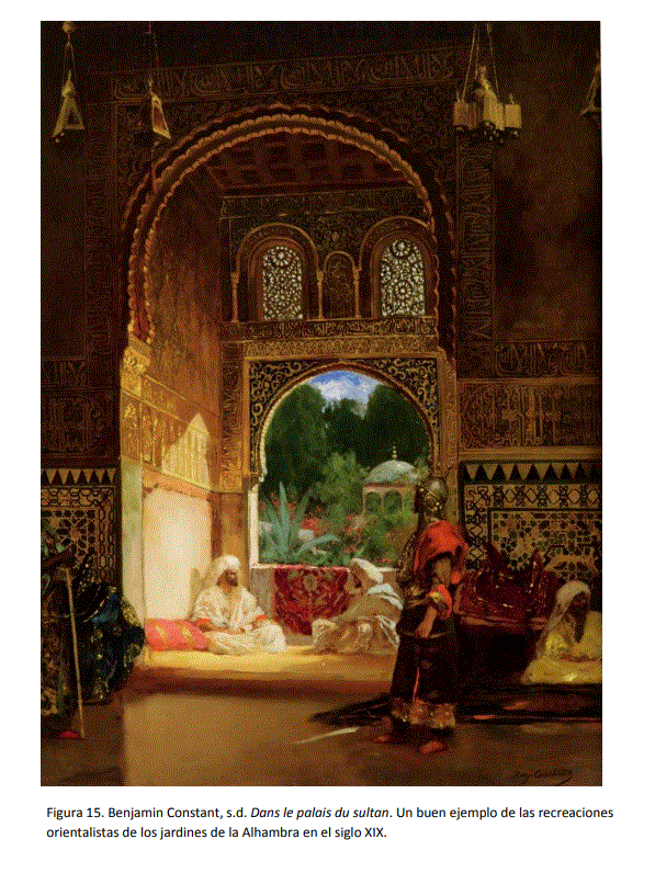 Muestra de esas fantasías son los innumerables jardines inventados por los orientalistas. Jardines irreales, imaginados, soñados, que a veces recrean un pasado inexistente, pero que, en el fondo, son ya parte de los jardines de al-Ándalus, pues el jardín no es sólo la materialidad sino también ensueño, se engrandecen en nuestra percepción con lo que se ha dicho de ellos, con la forma en que se les ha imaginado.