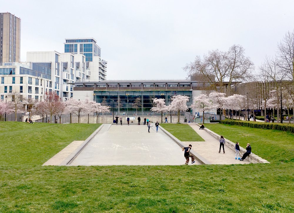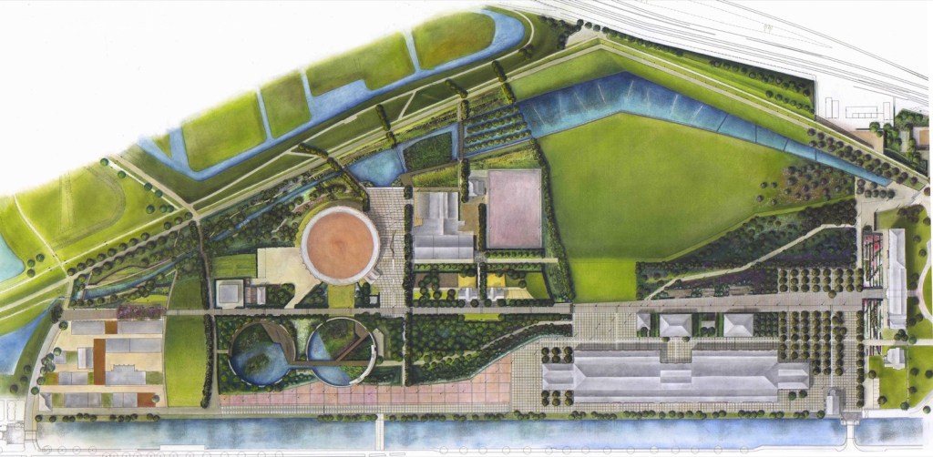 Era un sitio altamente contaminado como resultado de los procesos industriales necesarios para crear gas a partir del carbón durante los siglos XIX y XX. La solución de diseño era crear una serie de espacios flexibles de paisaje entre los edificios existentes que se unían mediante un eje central. Los espacios clave son el campo de eventos y el montículo, un espacio para 10,000 personas.