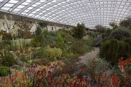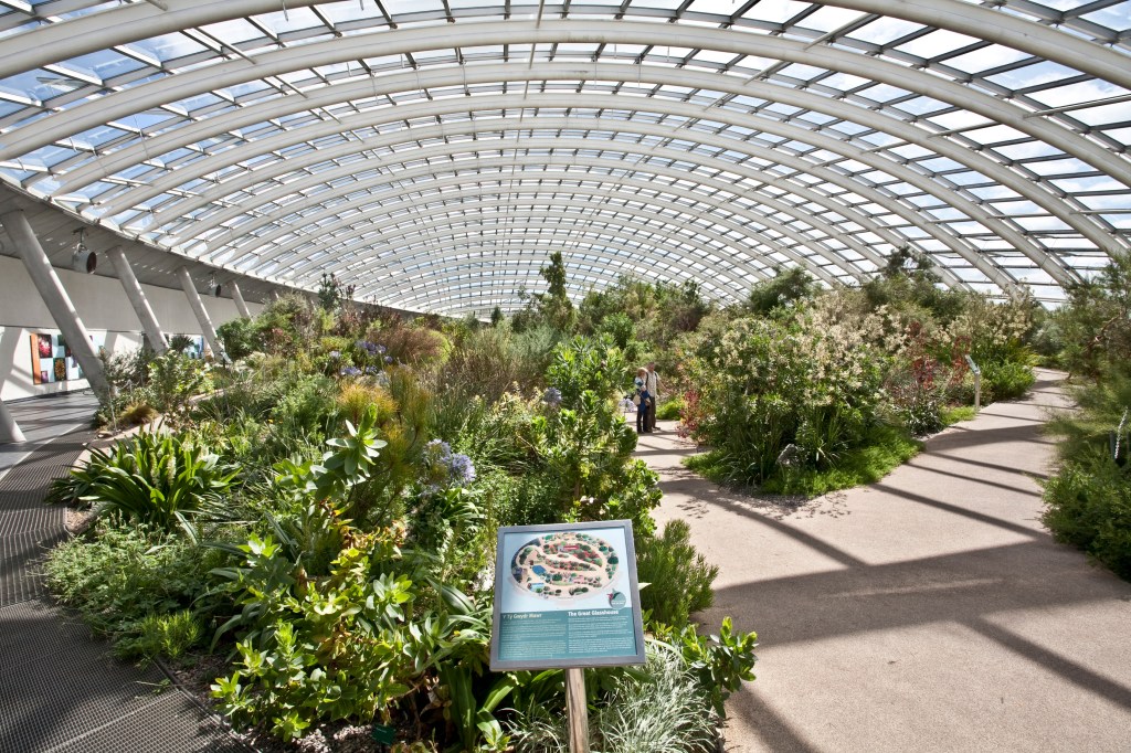 Great Glass House – Paisaje interior – Jardín Botánico de Gales, Camarthan – un barranco cortado en el suelo proporciona la ruta a una habitación secreta y múltiples terrenos para plantas mediterráneas
