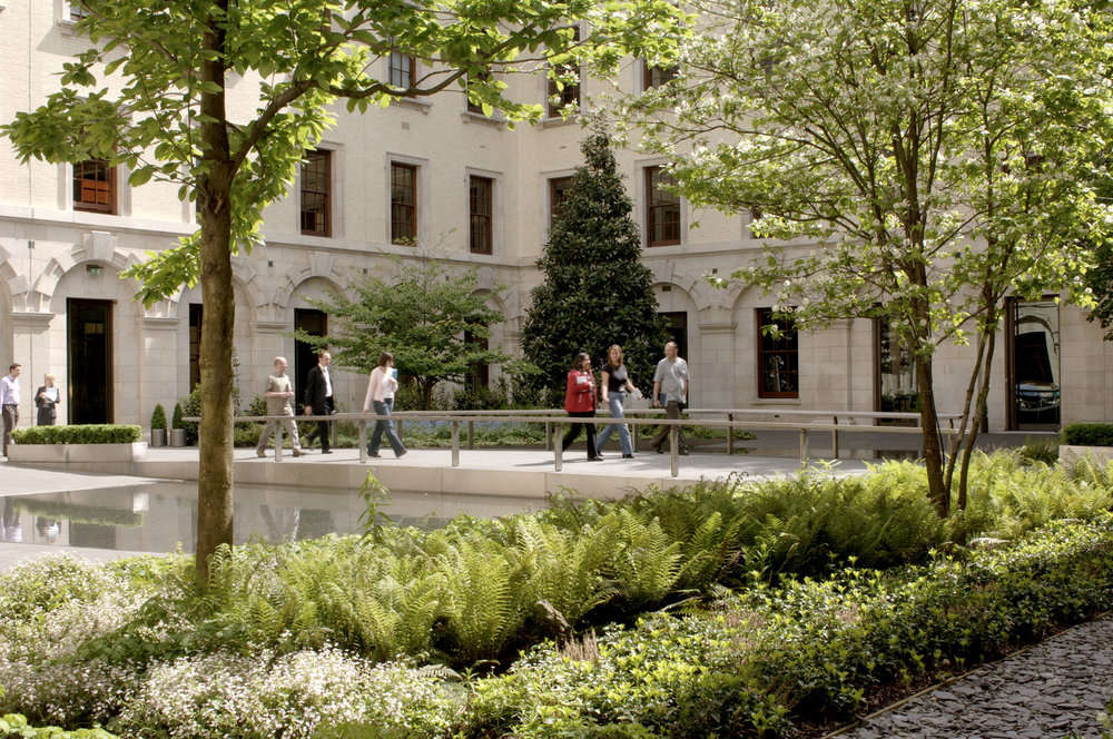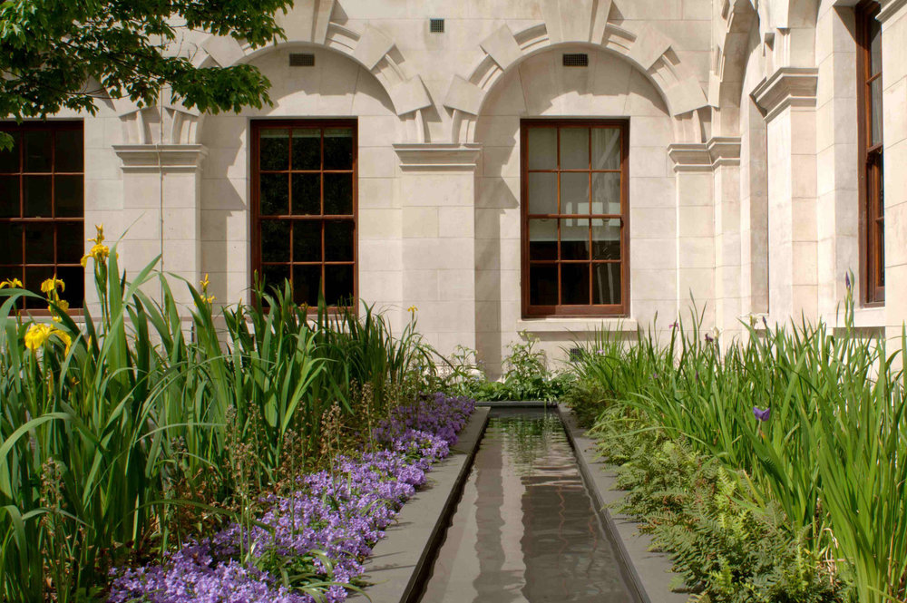 Londres – sutiles superficies curvadas y con platos crean una calzada y una piscina que relajan la formalidad del espacio. Los árboles y la piscina dan la impresión de estar ubicados en un terreno real en lugar de estar ubicados sobre un sótano.