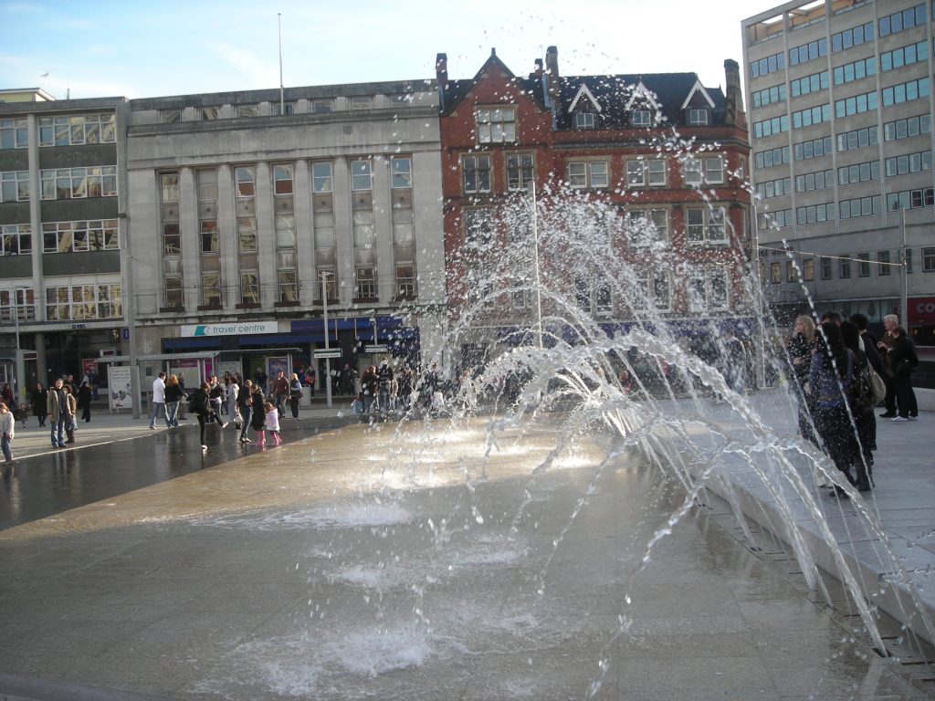 Old Market Square – Public Square – Nottingham – una plaza cívica formal fue transformada por la introducción de rutas diagonales, terrazas para sentarse al sol, una fuente de agua y una gran superficie plana para eventos, la plaza puede convertirse en una playa de la ciudad y la característica del agua se convierte en el evento en días sin evento.