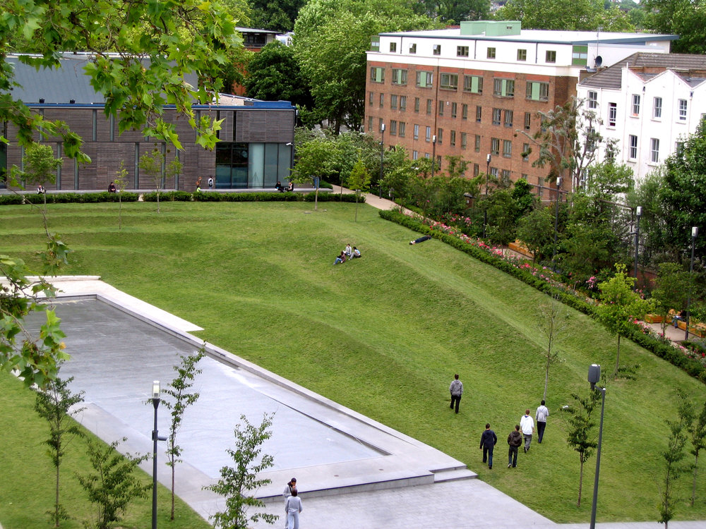 Swiss Cottage Open Space – Community Garden – Londres – la necesidad de proporcionar un campo deportivo y un espacio claramente observado para reunirse y jugar llevó a dos anfiteatro esculpido conectado por césped y piedra.
