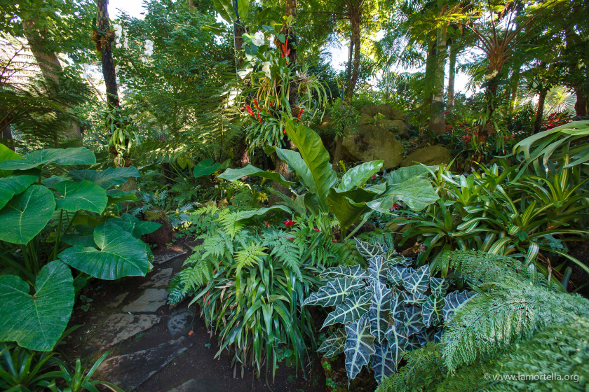 En el invernadero se cultivan orquídeas, bromelias, araceae y dos espléndidas trepadoras: Strongylodon macrobotrys y Thumbergia misoriensis.