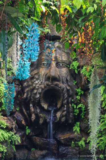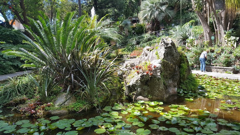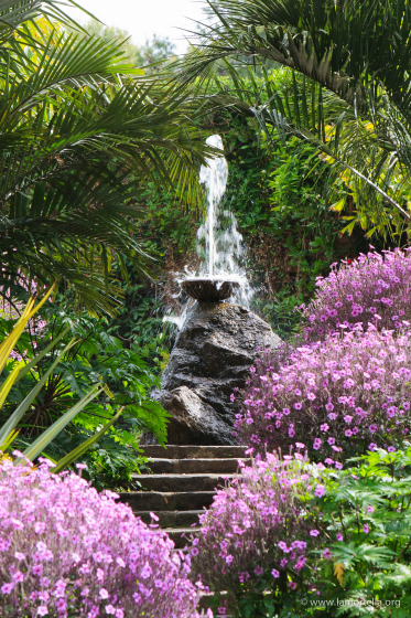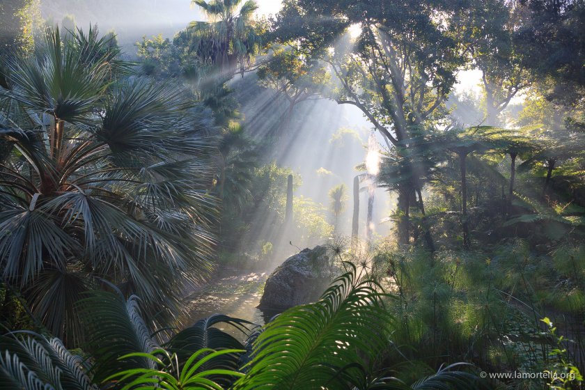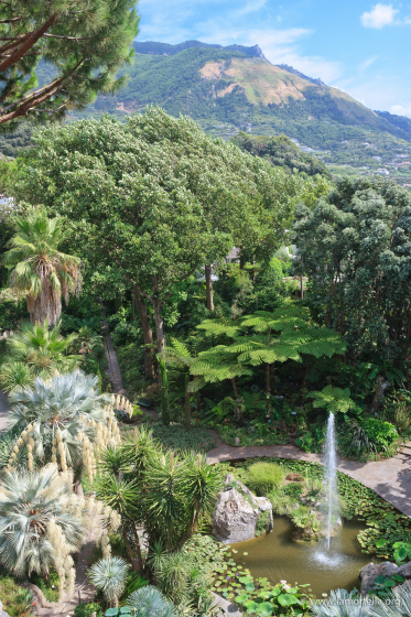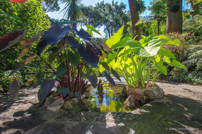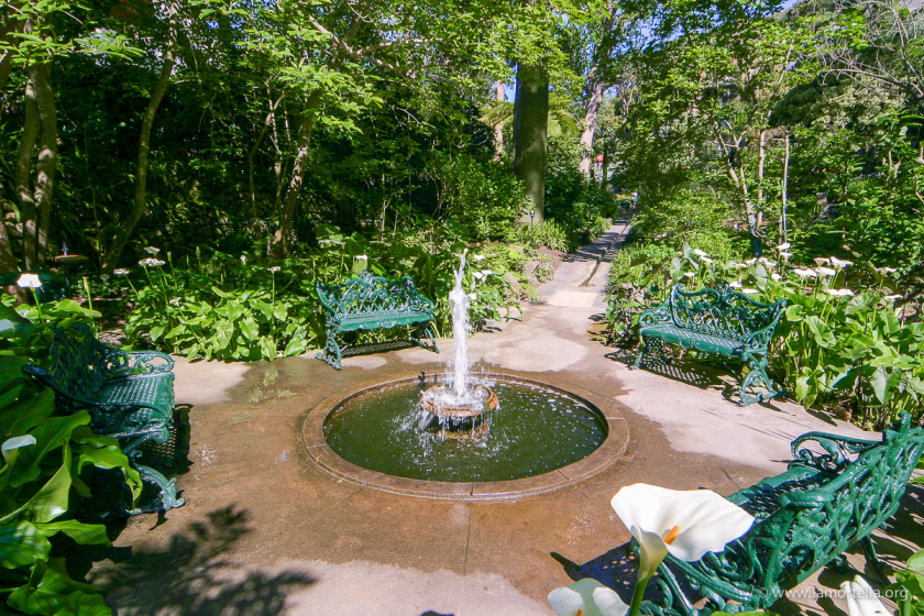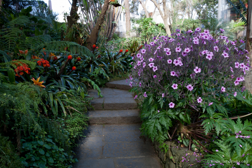 Las dos fuentes están conectadas por escalones de piedra flanqueados por helechos arbóreos y geranio maderense, mientras que en el lado más cálido, hacia la casa, hay una colección de palmeras Brahea, Yucca, Agaves y plantas suculentas que aman la exposición más soleada y seca.
