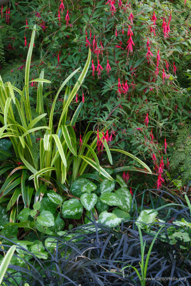 El jardín «La Mortella» no solo presenta una rica colección de plantas con flores, sino también muchos especímenes elegidos por su forma o el color del follaje. Russell Page, el arquitecto que diseñó este jardín, no quería una composición de flores ornamentales solamente. Pensó que un exceso de color podría perturbar la tranquilidad porque, conscientemente o no, la mirada se distrae con los colores y deambula sin descanso. Prefería el juego sutil de formas y volúmenes, el diseño de ramas y el follaje de los árboles que se destacan contra el cielo. Entre las plantas más ‘arquitectónicas’, encontramos palmeras, cycadaceae, helechos arbóreos.