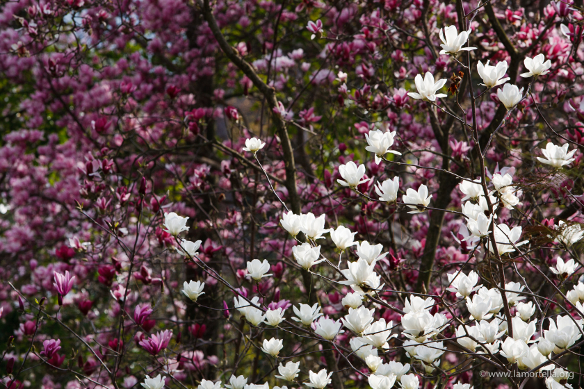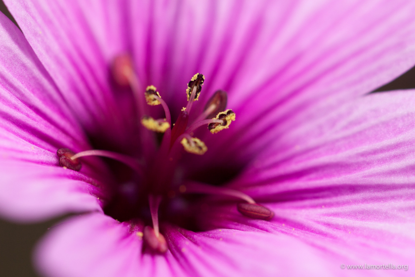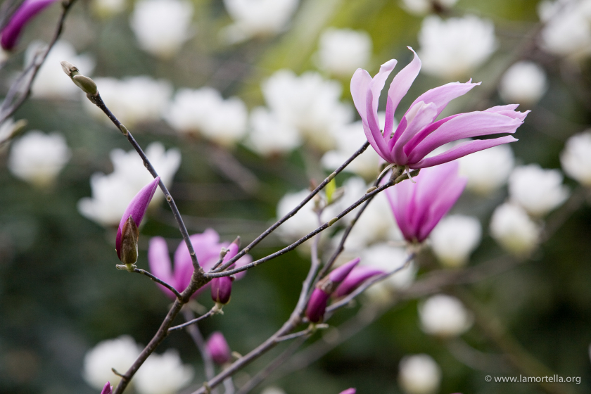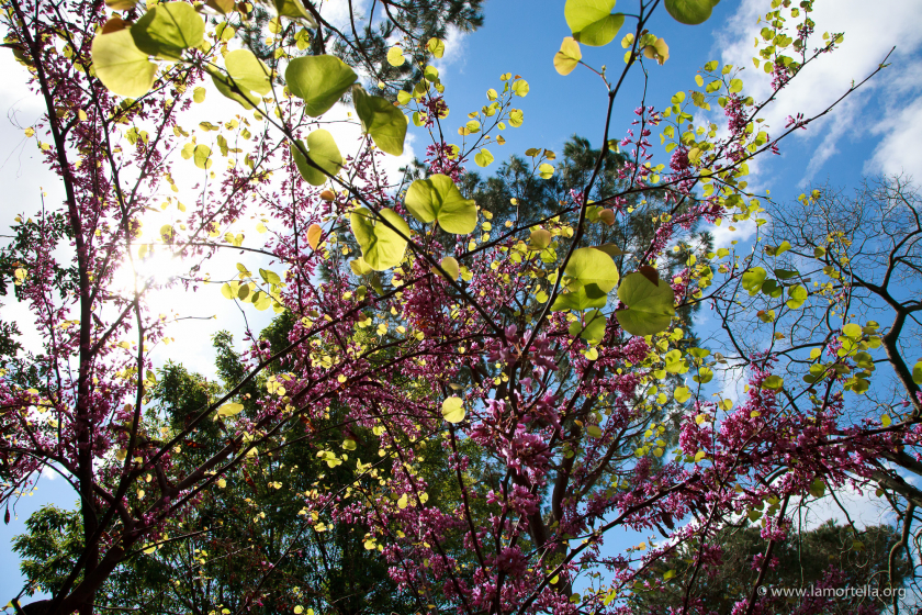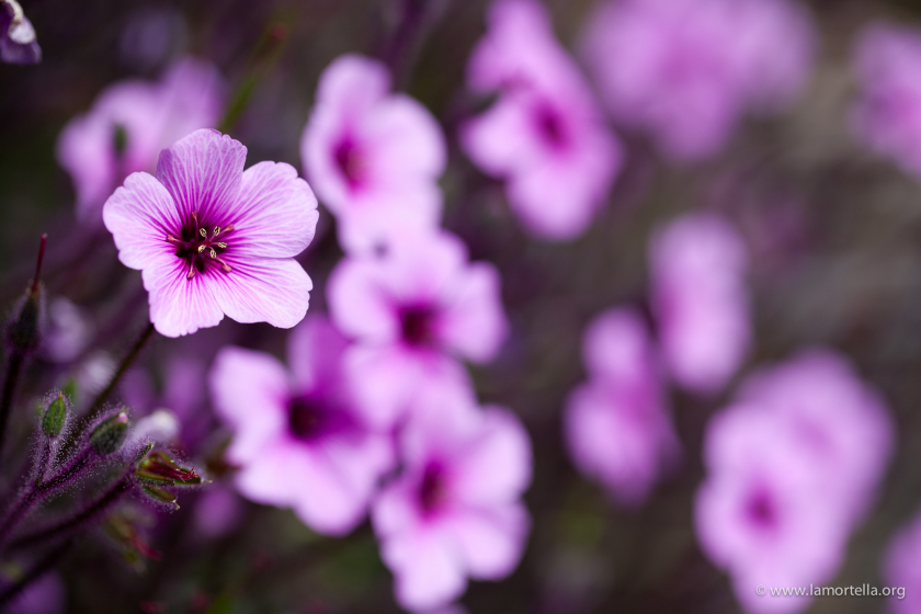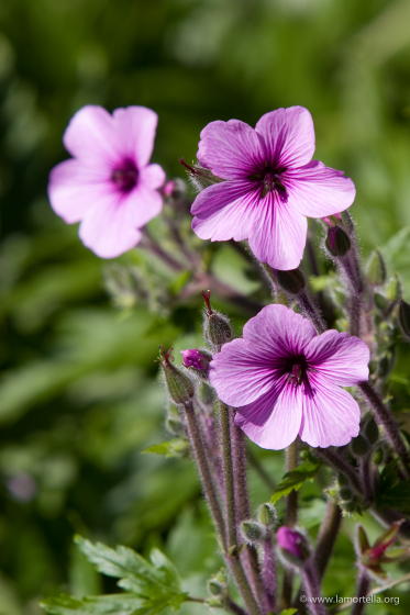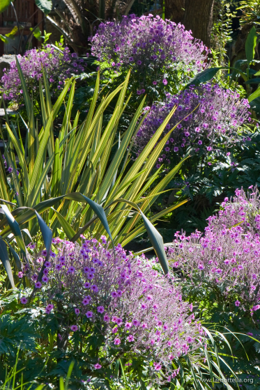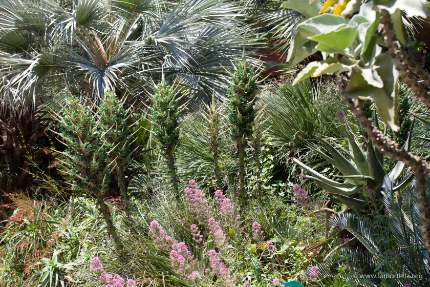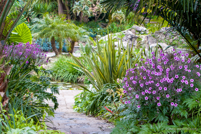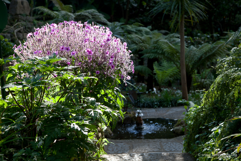 En abril, todo el jardín del valle se anima con la floración de Geranium maderense, originario de la isla de Madeira, una planta encantadora con sombrillas de flores de color rosa púrpura. Estas plantas perennes no tienen un tronco real, pero las flores grandes están sostenidas por los tallos de las hojas inferiores que se curvan en el suelo, apuntalando la planta como contrafuertes. Este generoso geranio extiende sus semillas por todo el lugar, y sus hojas son elegantes y decorativas durante la mayor parte del año.