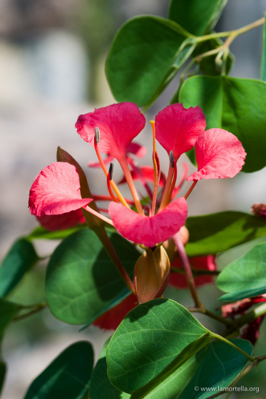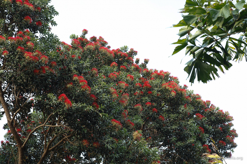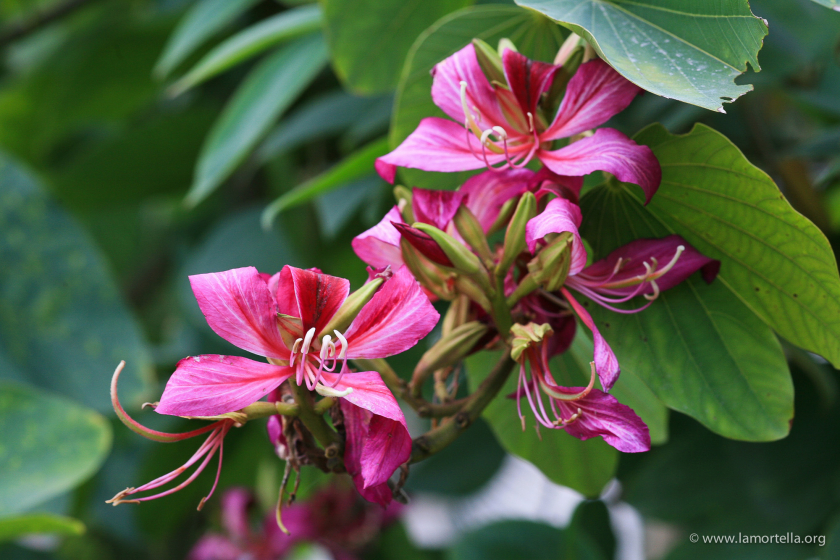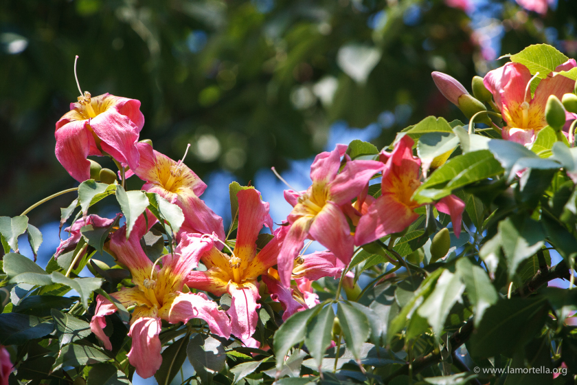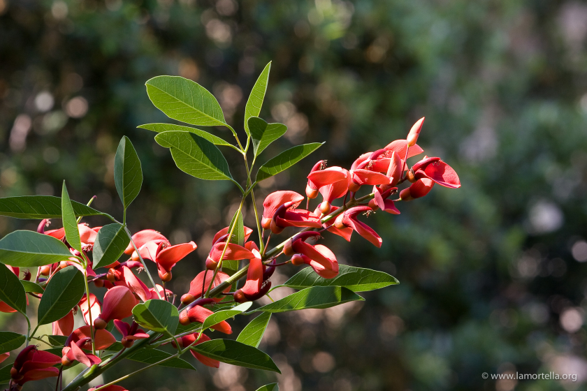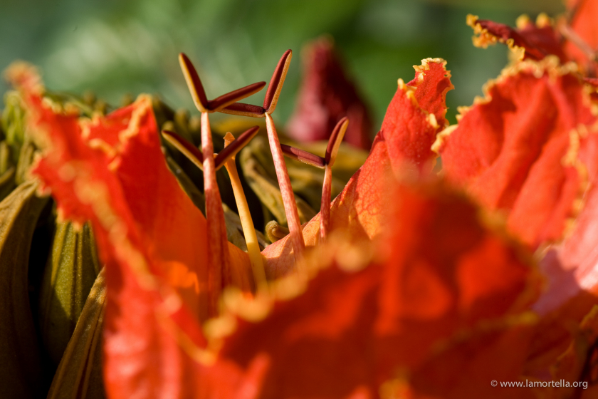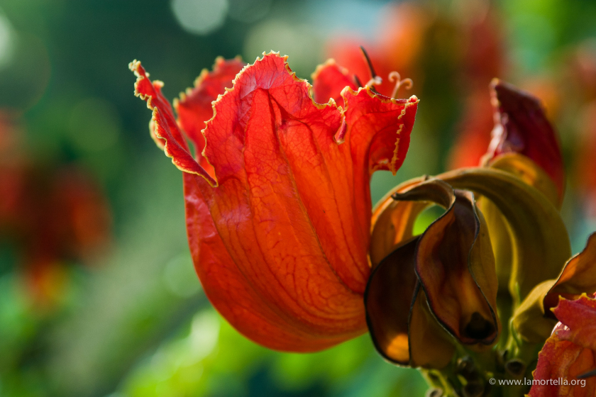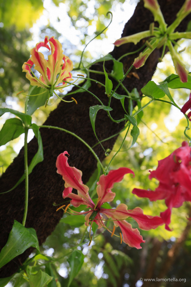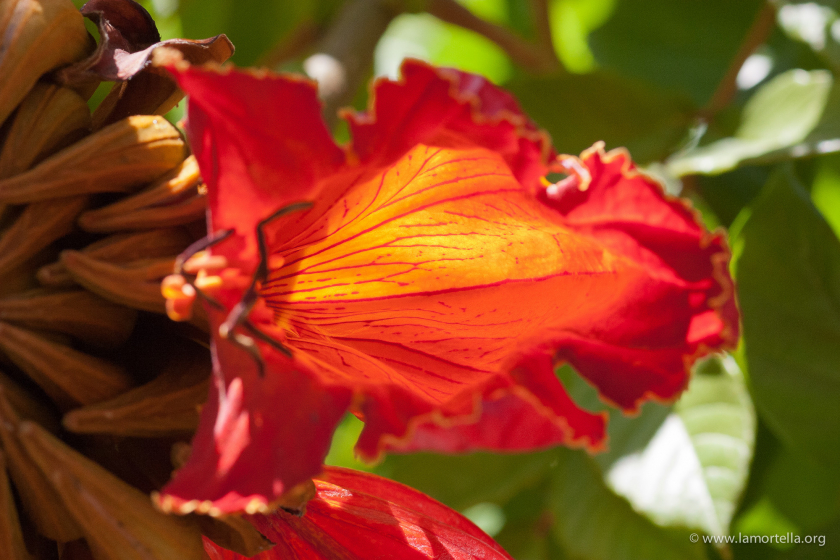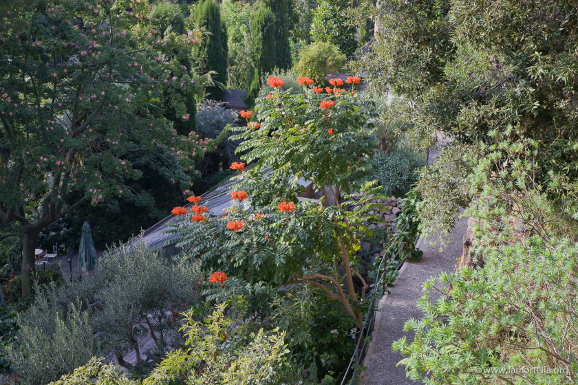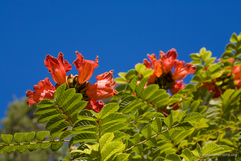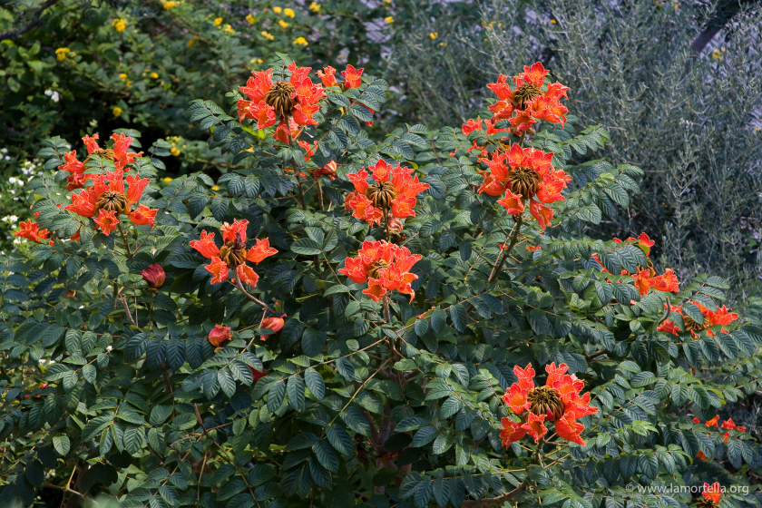 Cuando comience la escalada desde el jardín hasta el valle hacia la colina, notará en un rincón protegido de la roca la Spathodea campanulata, un árbol tropical africano que produce a finales del verano densos ramos de flores ahuecadas, de un color rojo brillante, individualmente fugaz pero que se siguen en flor.