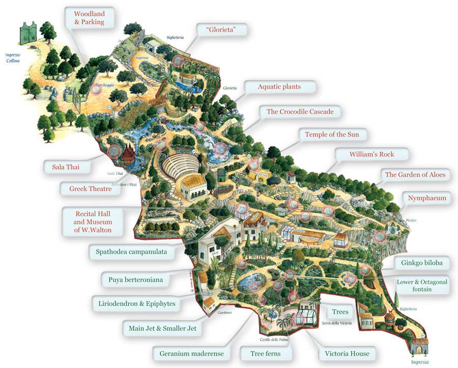 Otros puntos de interés son la Sala Thai, un lugar tranquilo para la meditación inmerso en un ambiente oriental, rodeado de flores de loto, peonías, bambúes y arces japoneses; la Cascada del Cocodrilo, también en el jardín superior, cuyo curso de agua serpentea entre olivos y agapantos, el Ninfeo con un diseño formal sorprendente entre la vegetación mediterránea y la Roca de Sir William, donde se guardan las cenizas del compositor.