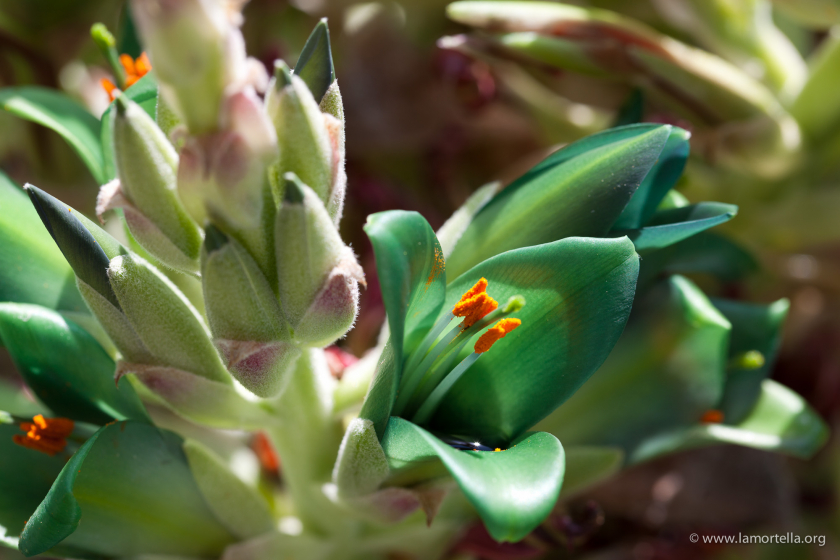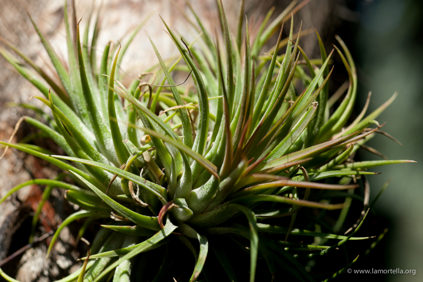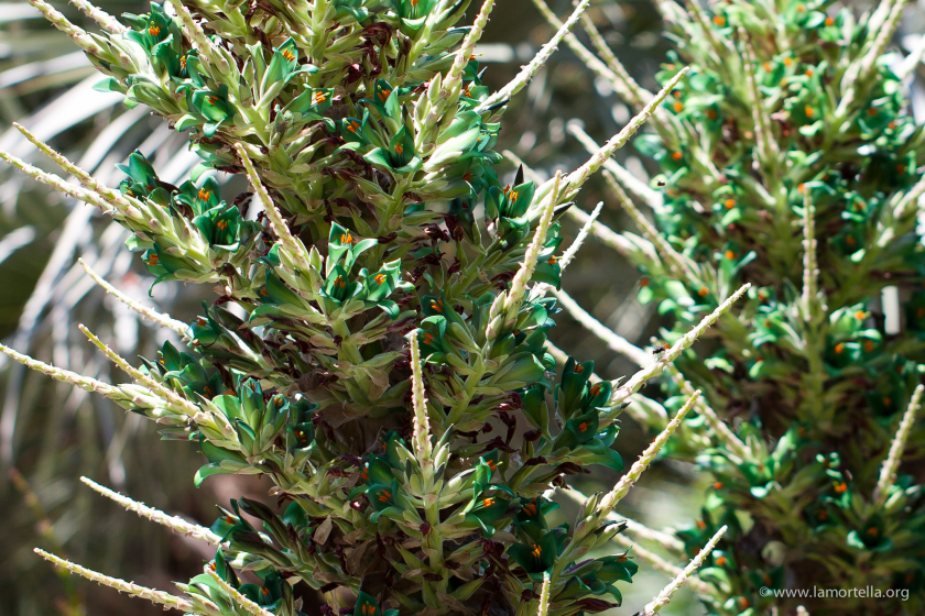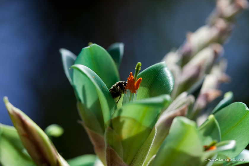 Junto a la fuente principal hay un grupo de Puya berteroniana, una bromelia originaria de Chile, que produce una espléndida espiga floral de dos metros de altura, cubierta con cientos de flores metálicas de color azul verdoso con vistosos estambres de color naranja. La planta tiene hojas plateadas y estrechas con márgenes cubiertos de espinas afiladas.
