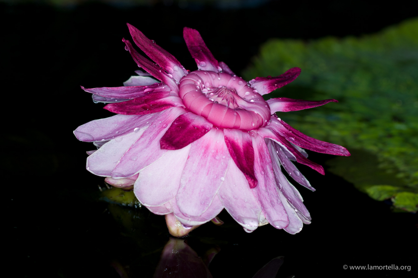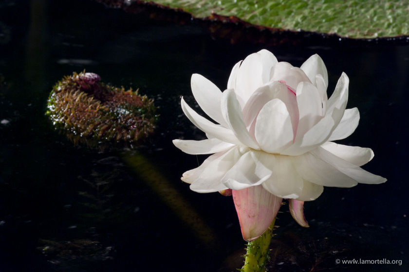 Definitivamente, la Victoria amazonica es la reina indiscutible del reino de los nenúfares. Sus enormes hojas redondas pueden alcanzar naturalmente dos metros y medio de diámetro, mientras que las flores también pueden medir cuarenta centímetros. La parte inferior de las hojas, el tallo y la parte externa del brote están cubiertos de espinas afiladas. Costillas resistentes y llenas de aire de hasta 15 cm de altura. cruzan la página inferior de las hojas permitiéndoles flotar. Las flores que se elevan en el agua son muy fragantes y tienen un modo de floración particular: el primer día son blancas y son femeninas, el segundo día son rojas y masculinas. ‘LEI’ florece al anochecer y permanece abierto hasta la madrugada del día siguiente, luego cierra. ‘HE’ vuelve a abrir en la tarde con los pétalos y sépalos cambiados a rojo púrpura. En una noche, la flor cambia de sexo y color, y luego se sumerge en las aguas.