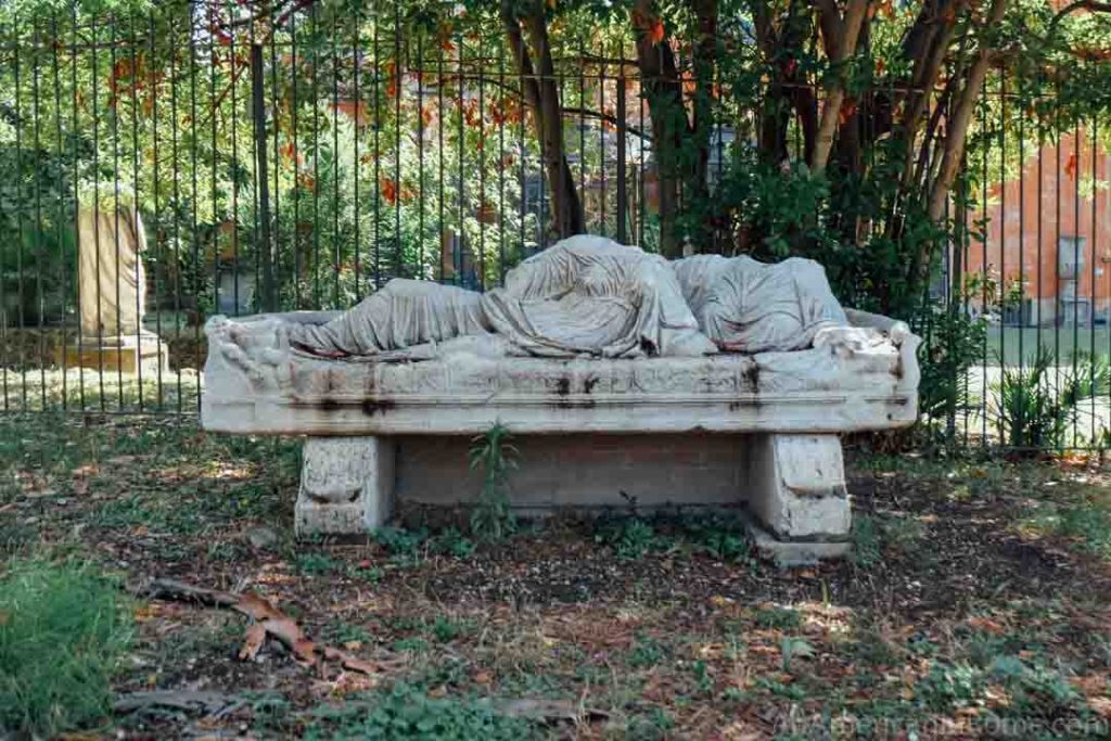 De las estatuas que estaban presentes en este jardín, ninguna se salvó de la decapitación, el trabajo de los «devastadores» habituales e impunes, también hay sarcófagos y un ninfeo en la entrada del palacio en via Panisperna. Dentro del jardín se encuentran los restos de un ninfeo adornado con estatuas, luego un camino de acceso adornado con fragmentos de mármol romano, y las escaleras en la vía Mazzarino están adornadas con un hermoso sarcófago antiguo.