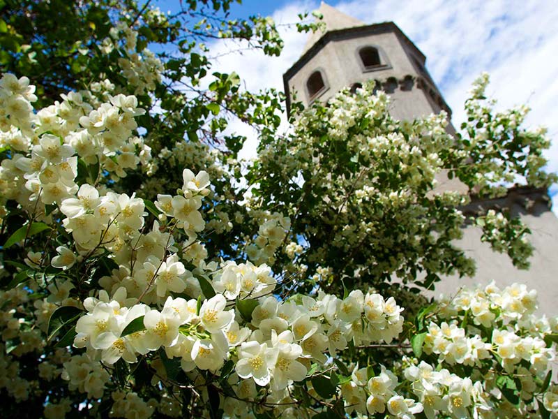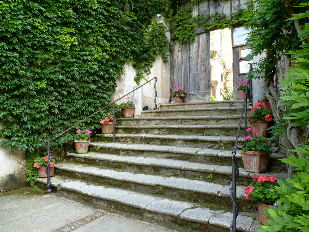 Una escalera, cubierta por un enrejado de glicinias, conduce a la Terraza de las Rosas, donde florecen variedades hermosas y fragantes. En el centro hay un reloj de sol en piedra clara, mientras que a los lados hay cuatro estatuas ornamentales: Flora (Diosa de las flores y la primavera), Leda con Swan y dos luchadores: Damosseno y Greucante.