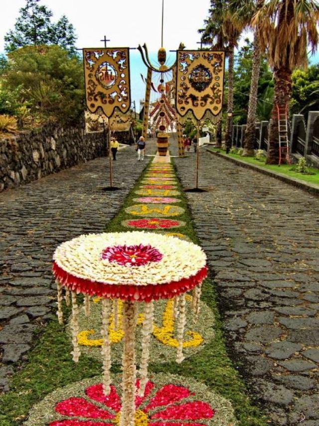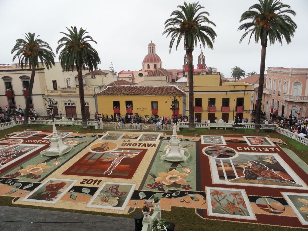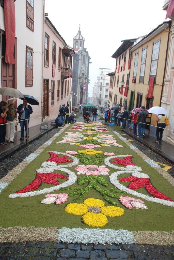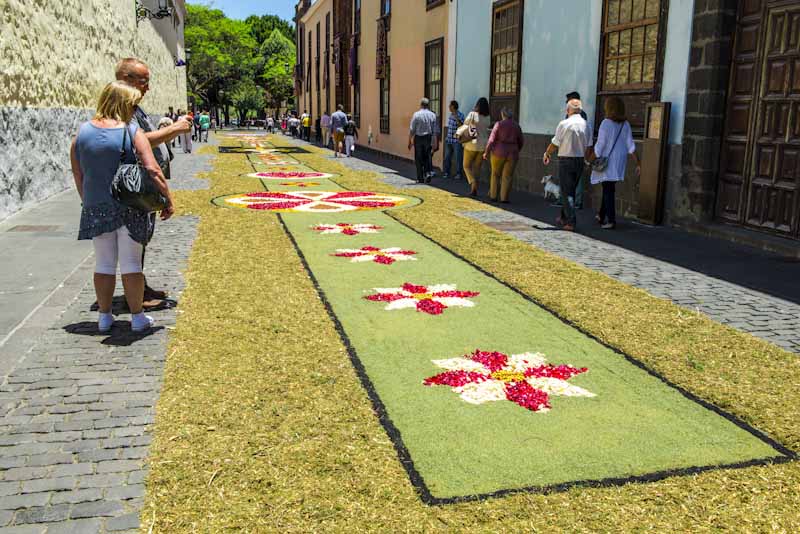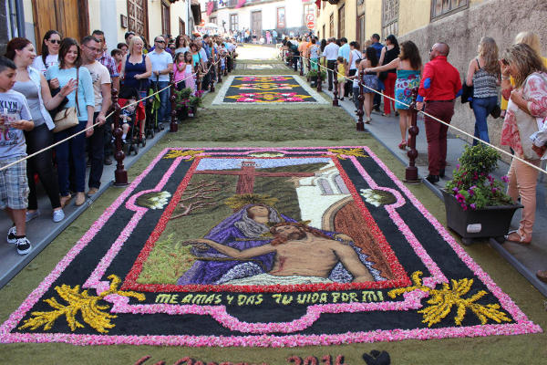 En La Orotava (Santa Cruz de Tenerife). Las calles se cubren de flores, siguiendo una tradición iniciada por una dama de la alta burguesía en 1847 que trajo la costumbre de Italia. Luego, cada familia cogió la costumbre de confeccionar su propia alfombra y, más tarde, con motivo de la visita del Alfonso XIII a la villa, se confeccionó por primera vez la monumental alfombra de la Plaza del Ayuntamiento, hecha con tierras de las Cañadas del Teide. Esta alfombra desde entonces suele representar episodios bíblicos.