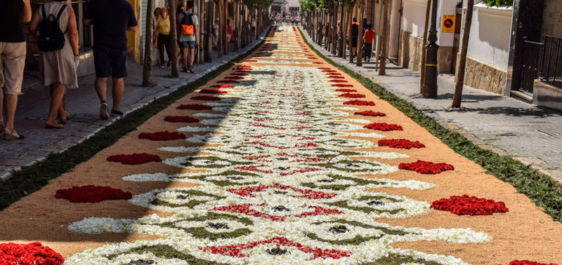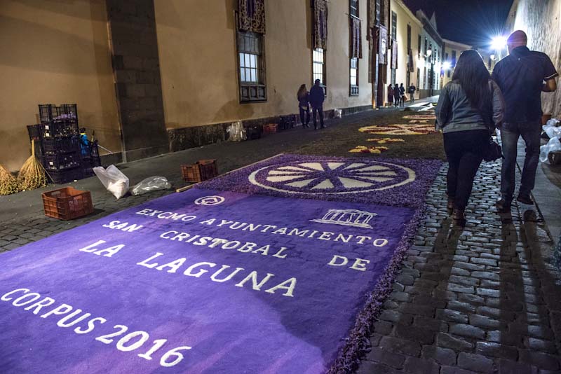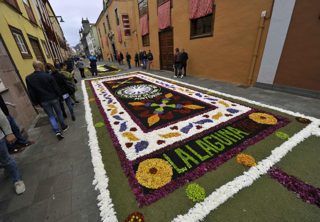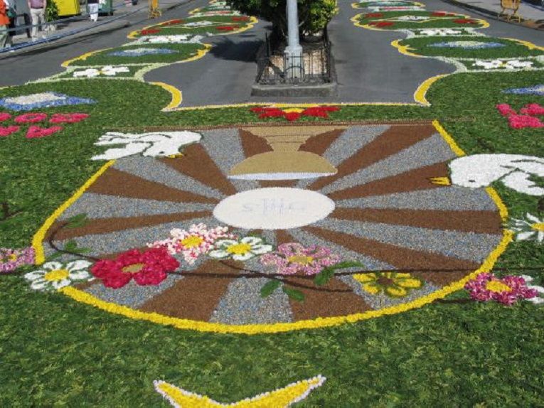 La Laguna (Santa Cruz de Tenerife). Alfombras de flores, fundamentalmente con motivos eucarísticos, cubren el recorrido de la procesión. El Corpus viene celebrándose en La Laguna desde 1496, apenas dominada la isla por Alonso Fernández de Lugo, Adelantado de las islas Canarias.