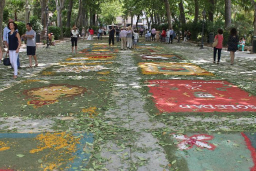 Elche de la Sierra (Albacete). Alfombras de serrín y viruta cubren el recorrido de la procesión. La víspera, por la noche, empiezan a elaborarse. Posteriormente se lleva a cabo un concurso que premia las más bellas. Los motivos son principalmente florales y se colocan por la parte baja del pueblo.