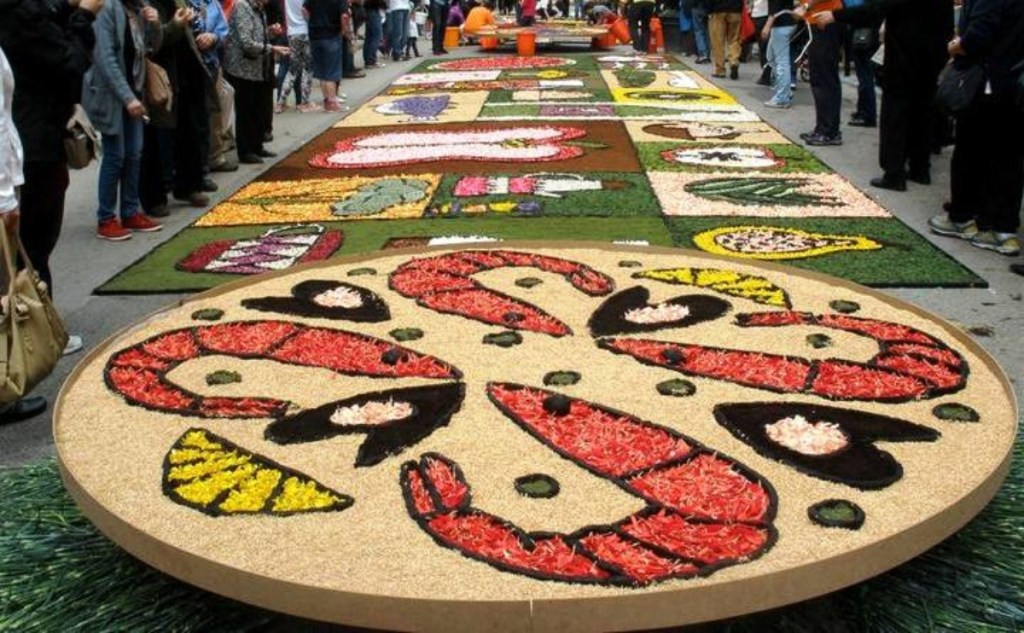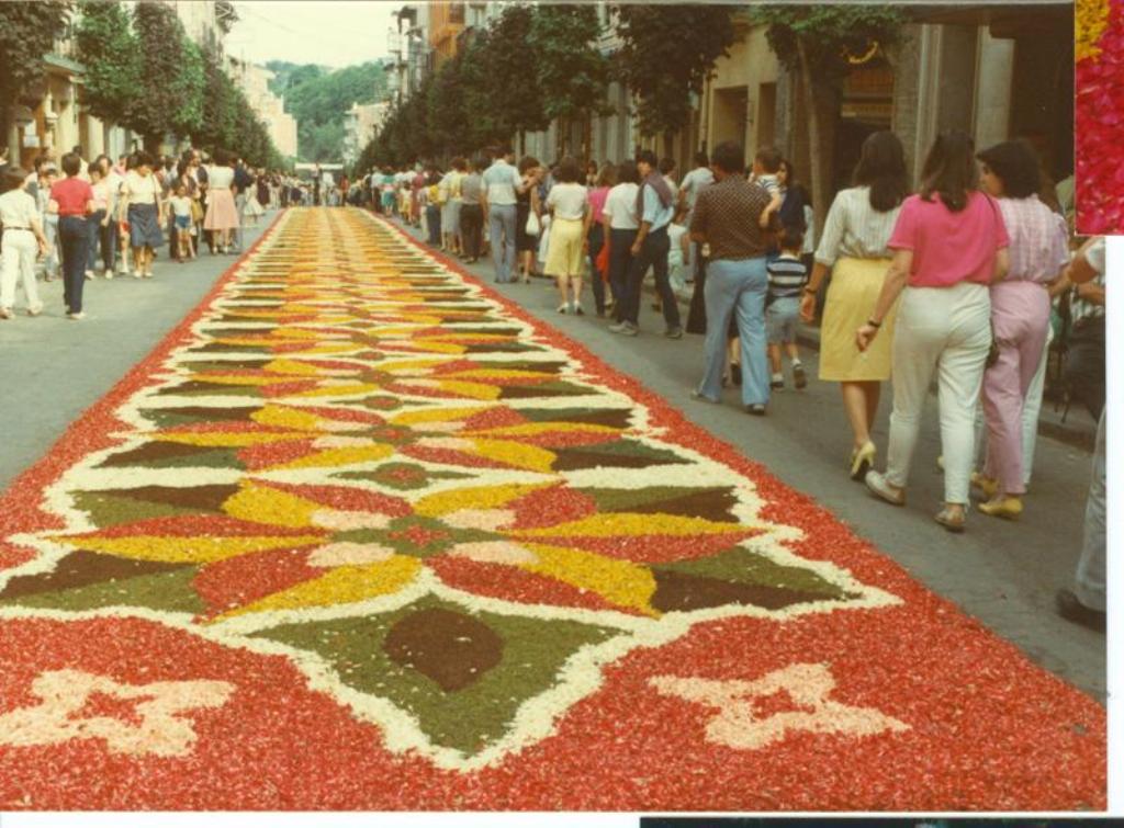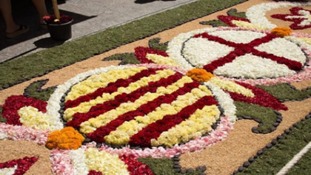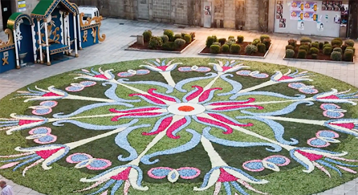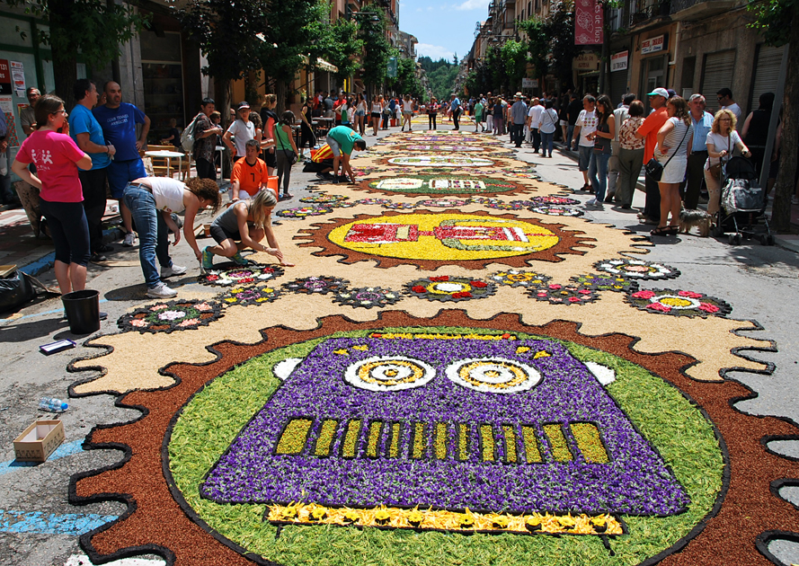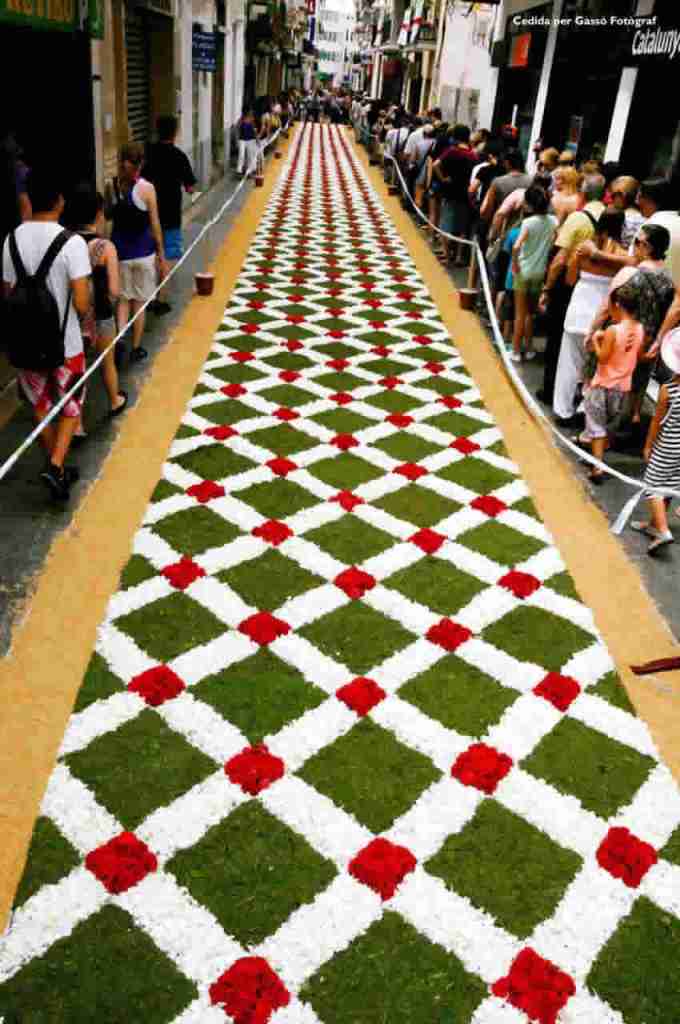 En Sitges (Barcelona). Concurso de Alfombras de Flores, fue declarado de Interés Turístico Nacional, el más concurrido de toda Cataluña con costumbre de «sembrar» con pétalos de flores las calles por donde había de pasar la procesión del Corpus se iniciaron a finales del siglo pasado.