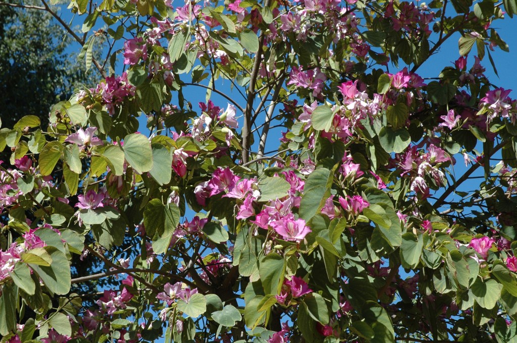También está la Bauhinia spp. La más espectacular y buscada, con flores de 15 cm en forma de orquídea de rico color rojizo o rosa púrpura durante el invierno, pero es muy sensible a las temperaturas heladas.