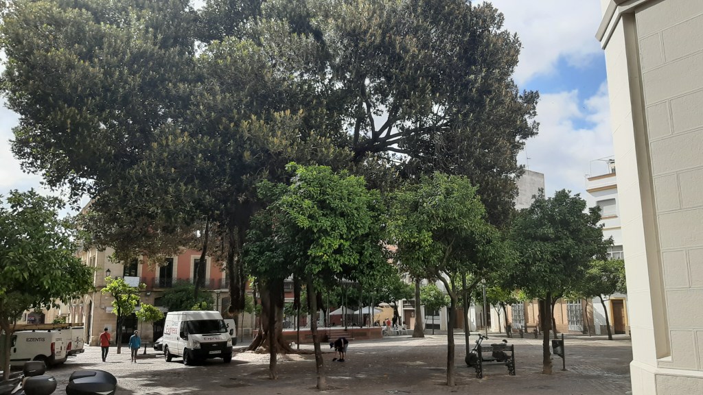 Al final de la calle la Plaza de la Yedra donde unas Jacaranda mimosifolia .-Jacarandás lucen sus flores en la punta de las ramas después de una poda de descope realizada en invierno. Un plaza pequeña con abundante sombra que se agradece.